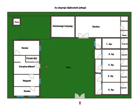 Az ingatlan 5 vendégszobával rendelkezik (4 franciaágyas + 1 különágyas), melyek mindegyikéhez saját fürdőszoba tartozik, így akár 10-12 vendég kényelmes fogadására alkalmas.