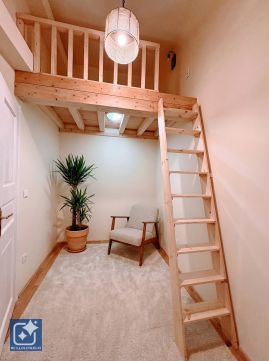 A lakás központja egy közel 35 m²-es, tágas nappali amerikai konyhával, amely ideális közös étkezésekhez, tanuláshoz vagy baráti összejövetelekhez. Innen nyílik két külön hálószoba, amelyek kompakt méretűek, viszont mindkettőben galéria növeli a hasznos teret így kényelmesen kialakítható külön alvó- és élettér.