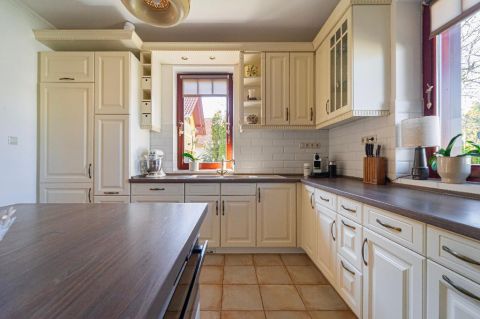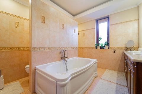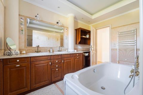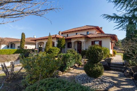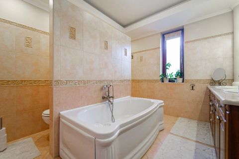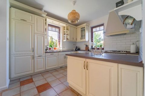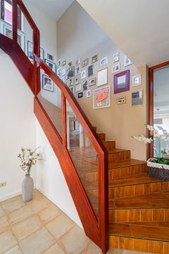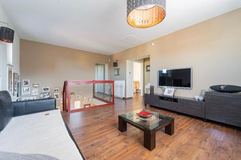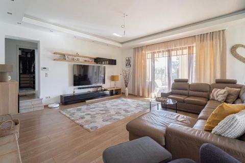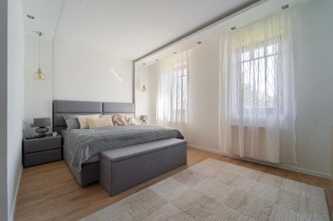 A belső elrendezés szerint a földszinten lévő étkező és nappali is egyaránt 32/35 m2, kényelmes és tágas, az étkező mellett van az emelethez a feljárat és a garázshoz való lejárat. A konyha egy légtérben van az étkezővel. A nappali közvetlenül a kertre néz és egy 62 m2-es terasz veszi körbe. A földszinten kapott helyet egy hálószoba gardróbbal, egy dolgozó szoba, és egy vendégszoba is. A földszinti fürdőben zuhanyzó és kád is van. A mosókonyha egy praktikus külön helyiségben kapott helyet. Az emeleten teljesen el lehet különíteni akár a gyerekeket, akár a hozzánk látogató vendégeket. 2 hálószobához és egy fürdőszobához egy nagy légterű második nappali tartozik. A hálószobákból közös terasz nyílik, pazar kilátással a csodálatos kertre.